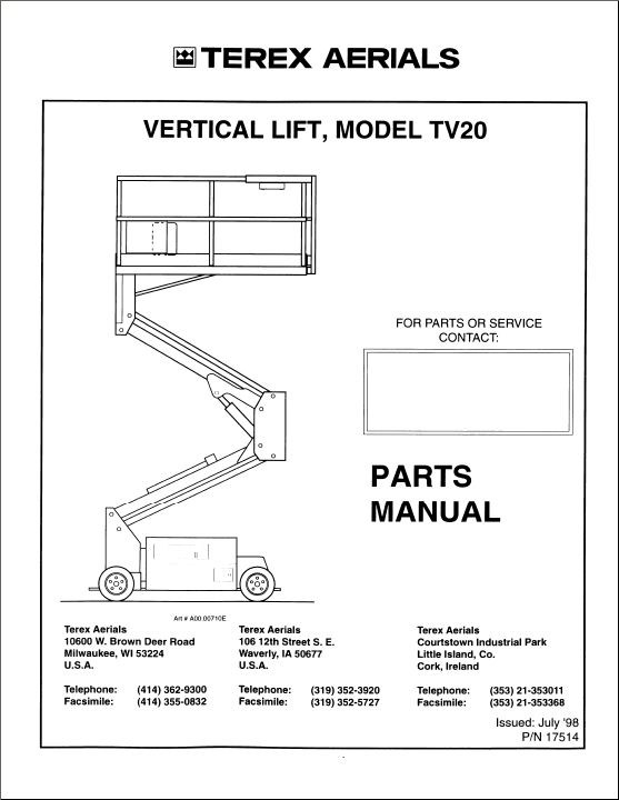 Каталог запчастей на подъемник вертикального типа Terex Aerials TV20