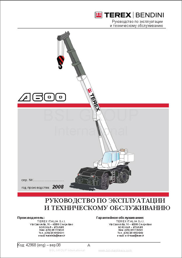 № TER-0003 TEREX-BENDINI A600. Руководство по эксплуатации и техническому обслуживанию крана Terex A600 (русский язык)